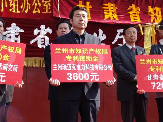 在第10个“世界知识产权日”来临之际,4月23日,以“创造·保护·发展”为主题的“2010年甘肃省知识产权宣传周活动”在东方红广场正式启动。甘肃省知识产权局、甘肃省公安厅、甘肃省高级人民法院、甘肃省人民检察院、、甘肃省工商局、甘肃省版权局、甘肃省质量技术监督局、兰州市知识产权局、兰州市工商管理局高新技术分局等25个厅局单位举行现场大型宣传咨询活动。甘肃省副省长郝远为兰州理工大学、中国移动甘肃分公司、甘肃农业科学研究院、兰州瑞迈克电力科技有限公司、甘肃土木工程研究院、甘肃紫鑫矿业有限公司等知识产权先进单位颁发了奖牌和专利资助金,高新区相关单位进行了知识产权产品展示,我公司还参加了保护知识产权现场签名活动。